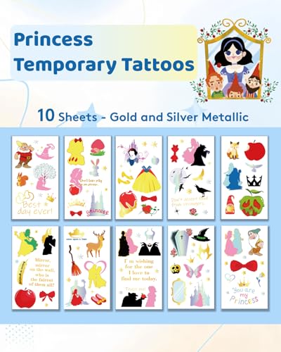 • Princess Temporary Tattoos: Super cute metallic princess themed tattoos with gold and silver foil. Contains a lot of princess elements, such as princess dresses, castles, witches, queens, etc