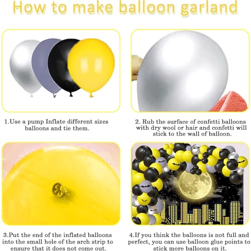 - Package Include:1 pc 5x3ft city backdrop;5 pcs silver balloons 10inch;5 pcs grey balloons 10inch; 20pcs black balloons 10inch;20pcs yellow balloons 10inch;8 pcs bats;15 pcs silver balloons 5inch;15 pcs grey balloons 5inch;20pcs black balloons 5inch;20pcs yellow balloons 5inch