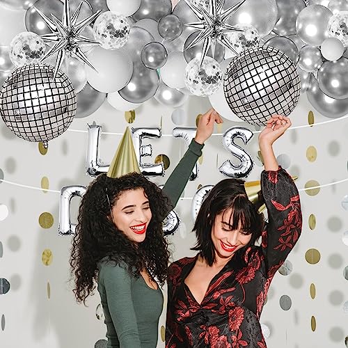 - Disco Birthday Party Supplies Set :Our disco themed party decorations set Includes 16 x 9 inch dinner plates, 16 x 7 inch desserts plates, 16 x plastic forks, 16 x napkins, 1 x disco table runner 105 x 54 inches, 12 x disco ball cupcake toppers,1set lets disco balloons banner(9 letter balloons,1 ribbon), 2 18 in big disco balloons,2 Silver Explosion Foil Cone Balloons. 46 x latex balloons , 1 glue dots, 1 ribbon,and 1 balloon chain.