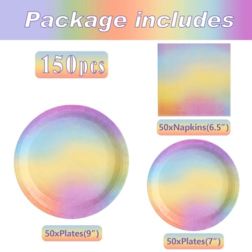 - Rainbow Pastel Party Supplies Serves 50:The rainbow plates and napkins party supplies come with 50 pastel paper plates (9"), 50 pastel dessert plates (7"), and 50 paper napkins (6.5").A total of 150 pieces are included.