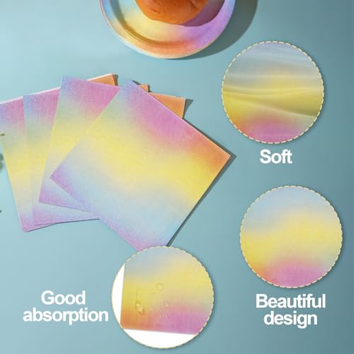 - Pastel Design: These pastel paper plates and napkins party supplies are designed with a gradient pink, green, purple, and yellow background. The pastel design is suitable for all ages. Your guests will be surprised by these pastel birthday decorations.