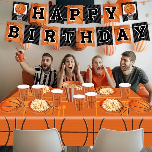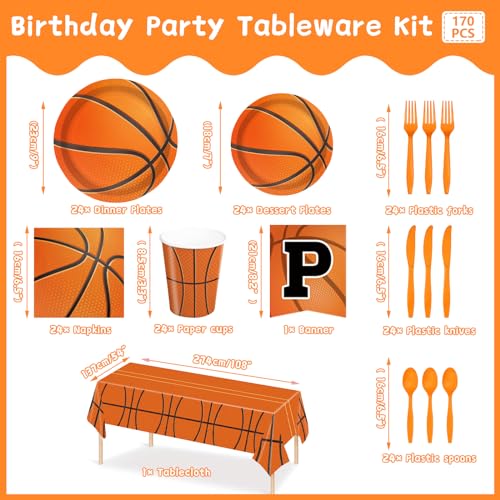 - 【Basketball Party Supplies】Basketball Birthday Party Supplies has a total of 170 basketball party supplies with 2 rolls of ribbon for basketball themed banners, 1 basketball tablecloth and 24 sets of utensils including plates, dessert plates, paper cups, napkins and knives, forks and spoons. Our basketball party decorations are designed to meet all of your party decorating needs.