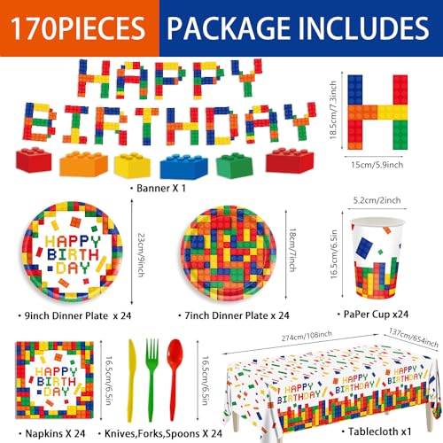 • 【Building Block Party Supplies】The colorful building block birthday party supplies include 24pcs 9” paper plates, 24pcs 7” paper plates, 24pcs 6.5” * 6.5” paper napkins, 24pcs 9oz paper cups, 24pcs knifes,forks and spoons,1pc banner, 1pc 54” * 108” tablecloth.