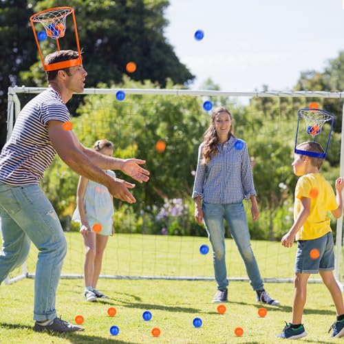 - 2 Pack Head Hoop Basketball Games Set Includes: 1 blue headband, 1 orange headband, 2 hoops, 2 nets, 6 Stent tubes, 10 blue balls and 10 orange balls, suitable for most adults and kids to wear, can bring more fun to the party games for your party.