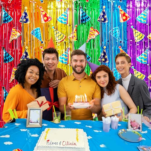 • Easy to Assemble: The birthday party hat foil fringe curtains comes with tape on the back, you can peel off the tape and stick it where you want to hang it such as walls, door frames, windows and more. Effortlessly and easily dress up your birthday party decorations