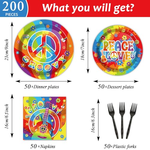 - 60's Party Hippie Tableware Set: You will receive 50pcs 9inch hippie themed paper plates, 50pcs 7inch hippie dessert plates, 50pcs 6.5 inch hippie paper napkins and 50pcs plastic black forks, each set can serve 50 guests.