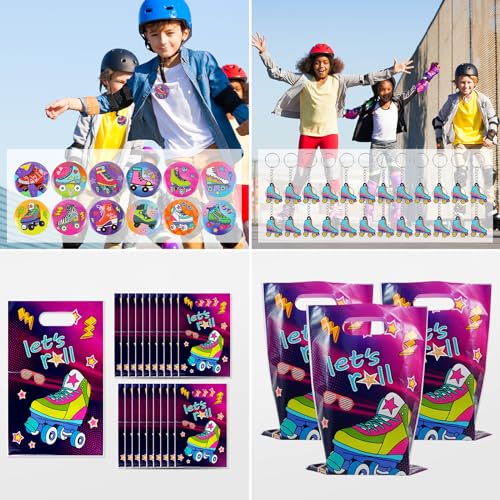 - Roller skate party favors set: there are a total of 220 pieces of roller skate party supplies, including 24 sheets of roller skate temporary tattoos, 24 roller skate badges,24 roller skate slap bracelets, 24 roller skate keychains, 24 roller skate gift bags and 100 roller skate stickers, different items with adequate quantity to satisfy your diverse and roller skate party using, decorating and sharing needs