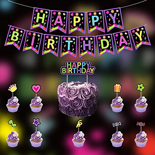 - Unique Design: Our glow birthday party supplies are designed with a black background, adding hearts, stars, glow gift boxes, candy, crowns, goblets, and colorful graffiti patterns. The vibrant neon colors bring a different visual enjoyment and brighten your party. The neon balloons and banners can glow under ultraviolet light, they will light up and show a fluorescent effect, but tableware and tablecloth are only for matching the glow theme, and the product itself will not glow in the dark.