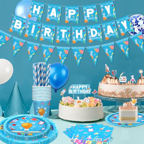 • What you will receive: 20 x 9" dinner plates, 20 x 7" dessert plates, 20 x napkins, 20 x cups(9 oz), 20 x knives, 20 x forks, 20 x spoons, 20 x straws, 25 x 10'' latex balloons(10 white 10 blue), 10 x 10'' blue metallic chrome balloon, 10 x blue confetti balloons, 1 x tablecloth, 1 x “HAPPY BIRTHDAY“banner, 1 x science theme triangle banner, 13 x cupcake toppers,1x glue point, 2x balloon ribbons, 1 x balloon chain.