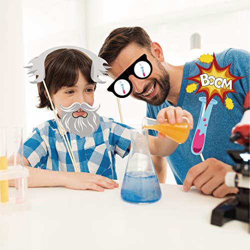 • Mad Scientist Photo Booth Props with Stick: 25pcs fun Scientist Photo Booth Props with 25pcs wood stick and enough quantity dot glue, perfect Science photo booth props set for event party supplies! Each design is unique and cute enough for your photo shoots and decorating needs. Mad Scientist Selfie Props, Embellish your Science themed party decorations candy buffet!