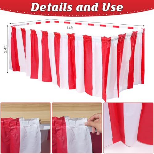 - What’s Inside: Included in the package are 3 red and white table skirts, each measuring 2.4x14ft, making them suitable for covering most tables. Perfect for carnival circus themed parties, these table skirts will add a pop of color to your gathering and help evoke fond memories.