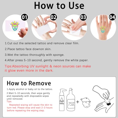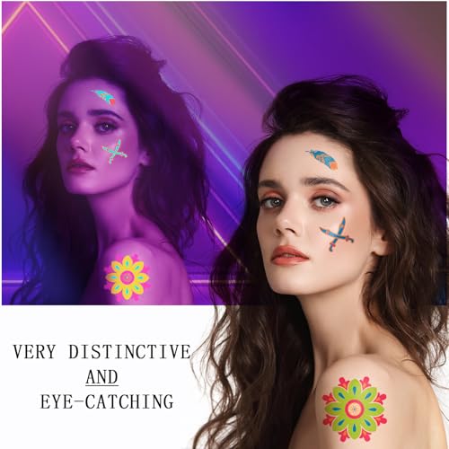 • Best Choice:UV neon light temporary tattoos use safe materials, are waterproof and last longer. Our fake tattoo stickers stick tightly to arms, face, waist, shoulders, collarbone and dry skin. Can be kept for more than a day and longer. Suitable for adults and children. Get it for fun!