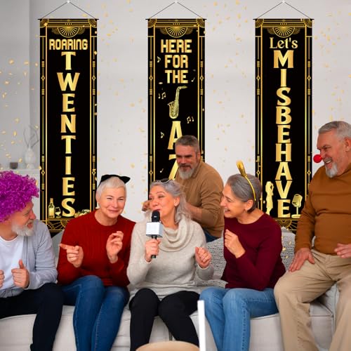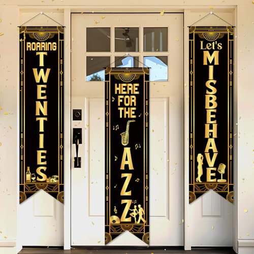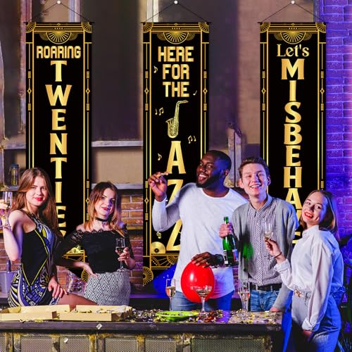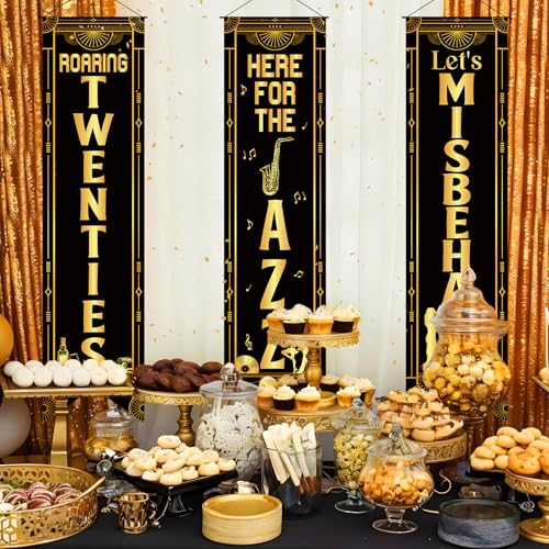 - Roaring 20s Party Decorations: These 20s party decorations include 1 piece of "Roaring Twenties" banner, 1 piece of "Here for the Jazz" banner, and 1 piece of "Let's Misbehave" banner, and are designed with rich black gold 20s jazz and music note elements
