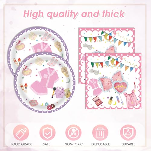 - Excellent Quality:Girls sleepover party supplies are made from high quality eco-friendly materials,which is both beautiful and durable.Pajama plates and napkins are made from high-quality paper that is tough,durability and sturdiness.Pajama tablecloth is made of environmentally friendly plastic.Sleepover party decorations pattern and color printing are exquisite,you can use it with confidence