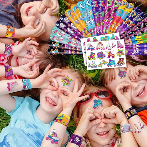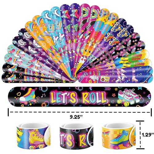 - 🛼【ROLLER SKATE PARTY FAVORS DELIGHTFUL BUNDLE】: Prepare for giggles with our set of 24 slap bracelets and 24 temporary tattoo stickers. Each piece features a lively and adorable design inspired by the ROLLER SKATE, Centerpiece, Sneaker Retro 60s 80s theme. Perfect for boys and girls alike, this bundle promises boundless enjoyment. The bracelets measure 23.5cm x 3.3cm, providing a gratifying "slapping" experience as they effortlessly encircle your wrist.