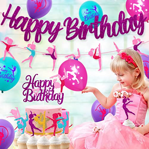 52 Pcs Gymnastics Birthday Decoration Set Gymnast Happy Birthday Banner Cake Topper 25 Cupcake Toppers Gymnastics Balloons for Girl Bday Glitter Party Supplies