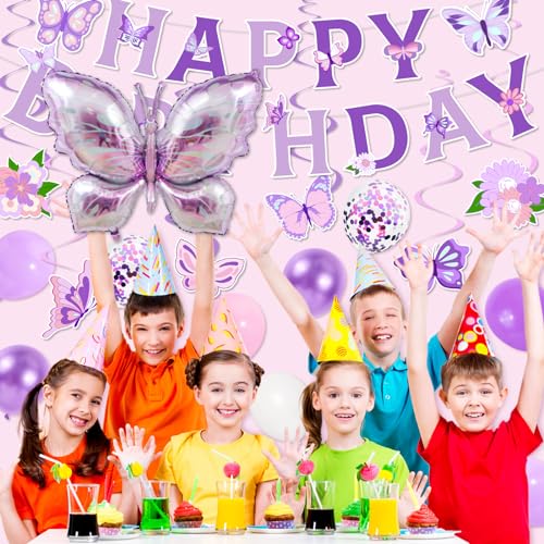53pcs Butterfly Birthday Decorations, Purple Butterflies Decorations with Honeycomb Ball Banner Butterflies Hanging Swirl Big Butterfly Foil Balloon for Women Butterflies Girl Theme Birthday Supplies
