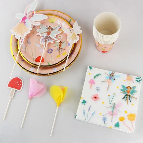 - [What Will You Get]: Our fairy party decorations included 1pcs fairy banner, 6pcs fairy cake topper, 10pcs 9'' fairy dinner plates, 10pcs 7'' dessert paper plates, 10pcs paper cups, 20pcs napkins, fit in fairy birthday party.