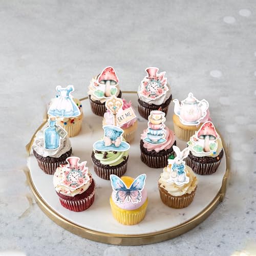 - Unique Design and Proper Size! Brace yourself for a ton of compliments.Your guests will love the unique alice in wonderland design on the cake and cupcake, these edible alice in wonderland cupcake toppers can be used at different theme party decorations