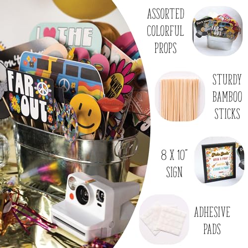 - Get the Perfect 60s Selfies: These funny 60s photo booth props are the perfect addition to your 60s party. Includes 40 props, one 8"x10" sign, 60 adhesive pads, and 45 sticks.