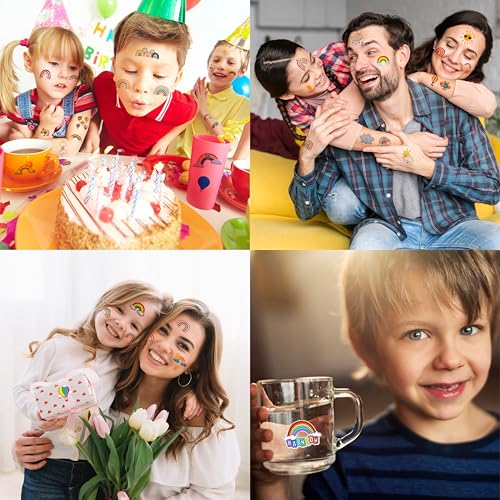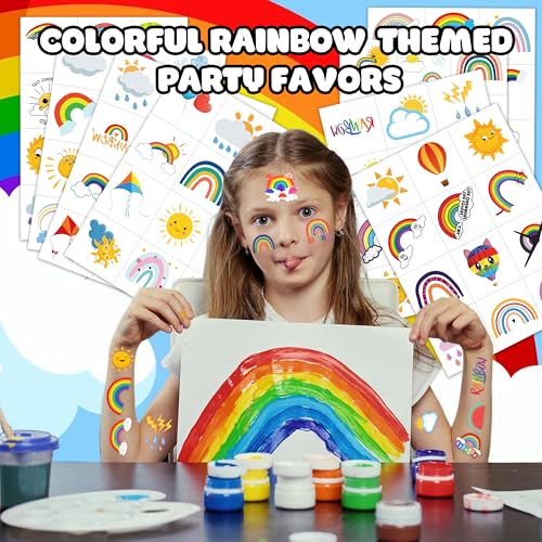 - RAINBOW PARTY SUPPLIES FAVORS: RAINBOW tattoos stickers cover various color tattoos with the emerging appearance of sunshine, rain, cloud, sky, and RAINBOW at all. Most of these nature patterns are to the point for holding Birthday party and outdoor party that will be reasonable choices for kids who have their hobby in nature things. During the moments of party, children have no boredom at all replaced with cheer plus excitement when they play with our tattoos^^