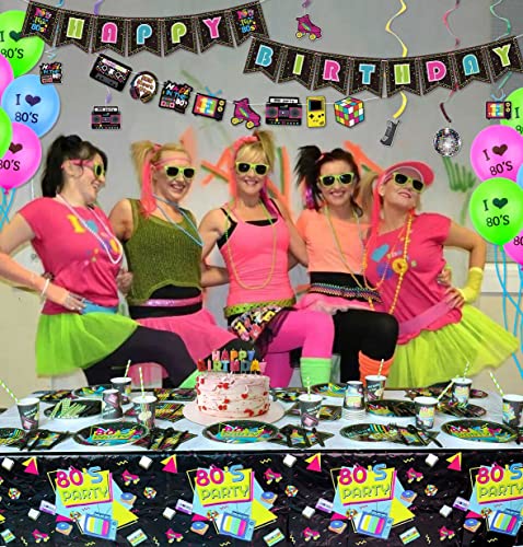 - VALUE PACKAGE – Vibrant 80’s Themed Retro Party Supplies including 1 x 80’s HAPPY BIRTHDAY banner, 1 x 80’s element bunting, 6 x 80’s hanging swirls, 20 x 80’s dinner plates, 20 x 80’s dessert plates, 20 x 80’s cups, 20 x 80’s napkins, 20 x tableware, 1 x 80’s tablecloth, 10 x 80’s cake toppers. 30 With 80’s latex balloons with each color of 10; sticky glues and ribbons are also provided.