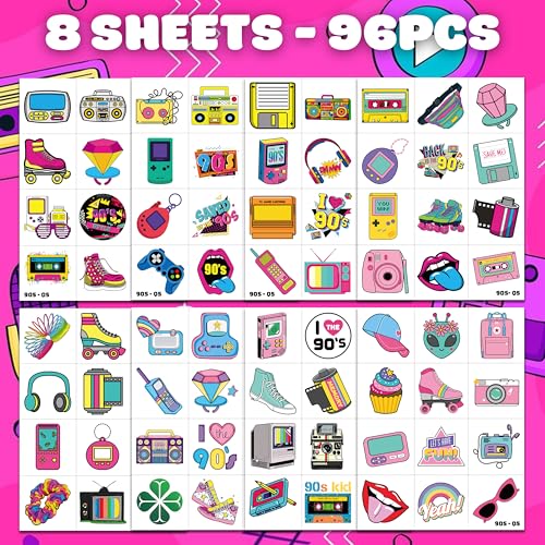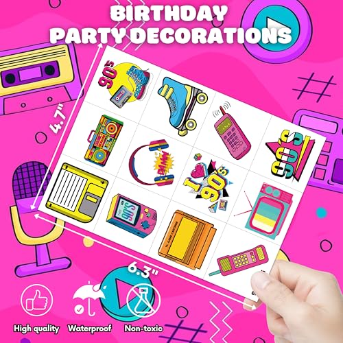 - The Perfect 90s 80s Theme Birthday Party Supplies Gifts: 8 Sheets 90s 80s retro Pre-Cut tattoos stickers, each pattern measures 6.3 * 4.7 inch , one size fit all adult and kids. One of the most popular party themes for children, make the best party gifts for your children & Carnival gifts, help your children become small heroes at the party!