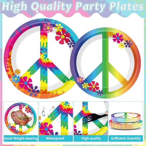 - Eye-catching design: Using this hippie theme party tableware for girls to decorating your hippie party. Our tie dye groovy tableware set party supplies are designed with peace badges and flowers in a colorful pattern that fits a 1960s hippie background can add ambience to your party and impress your guests.