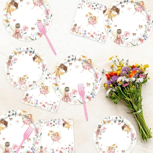 - 【Pack Value】 Fairy paper plates and napkins set totals 96 Pcs, 9"dinner plates, 7" dessert plates, napkins and forks, 24 each to serve 24 guests. The all-in-one set fits girls' fairy birthday parties of all scales, with great cost performance and real value.