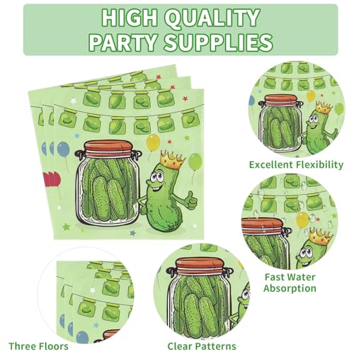- Pickle Party Supplies: Our pickle cucumber party disposable tableware set include 24pcs pickle dinner plates (9inch),24pcs pickle dessert plates (7inch),24pcs pickle napkins(6.5inch), 24pcs green forks,making a total of 96 pieces.Make your party unforgettable with green pickles themed party decorations