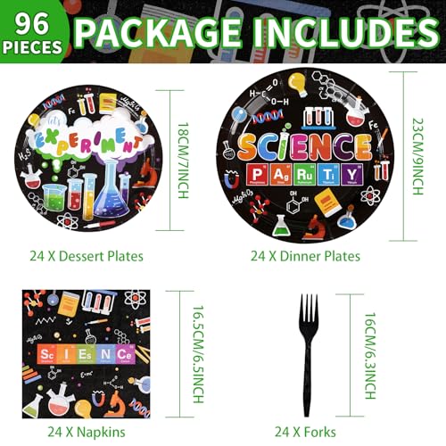 - Thoughtful Combinations, Ideal Selection: Our 96 pcs science themed tableware set includes 24 9" science plates, 24 7" science plates, 24 science napkins and 24 Forks, enough to serve 24 guests. Experience the perfect blend of style and convenience for all your party needs