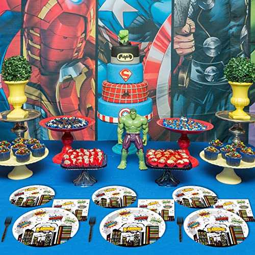 - 【Super Theme Hero Birthday Party Supplies Serves 24】 This Hero party supplies set includes: 24 plates (9inch) + 24 plates (7inch) + 24 napkins (13inch) + 24 forks, there are a total of 96 pieces in this set, which will add fun to any birthday party