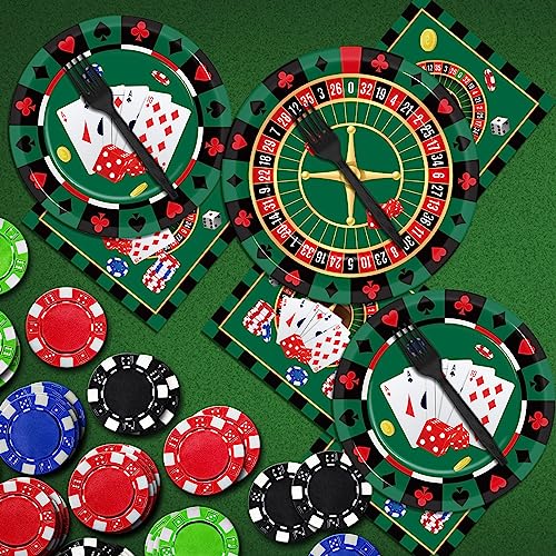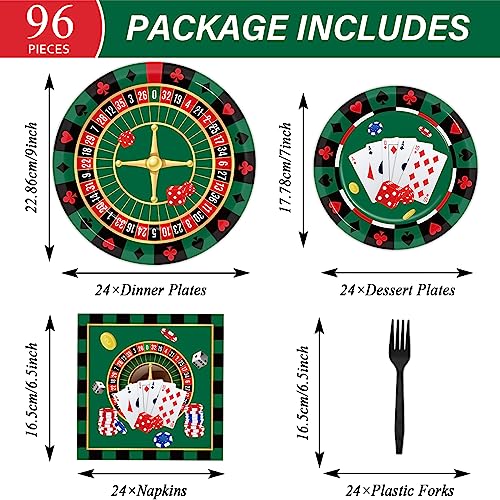 - Package includes:Casino poker tableware set includes 24 9-inch plates, 24 7-inch plates, 24 green forks, 24 double-layer napkins, and a wide variety of color and patterns, allowing 24 people to enjoy the perfect meal happily.