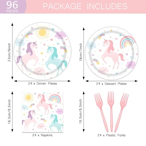 - 【Full Set Value】 This 96-piece disposable unicorn tableware includes 9"unicorn paper plates, 7" pastel rainbow dessert plates, birthday napkins and pink party forks, 24 pcs each, a one-stop birthday kit for girls with no need for separate purchases.