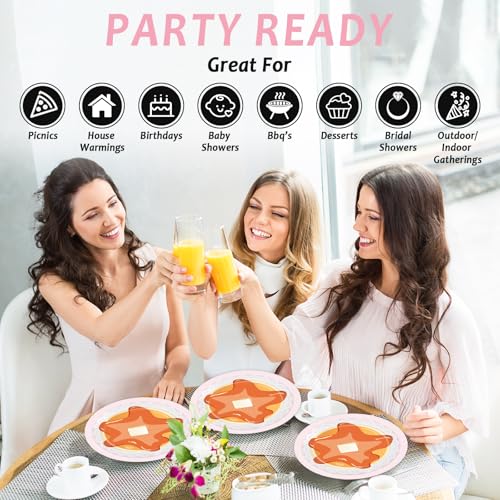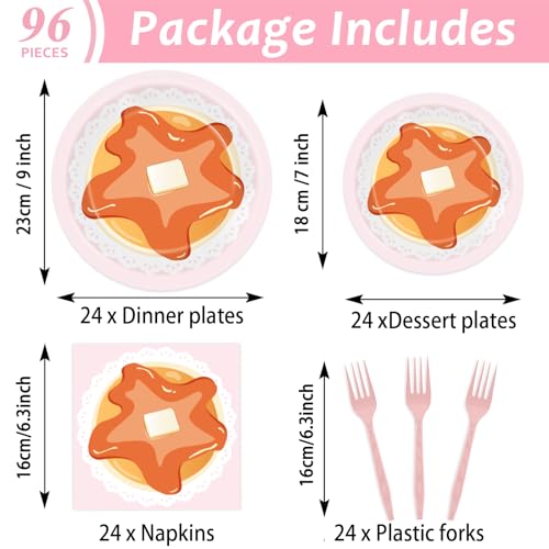 You will get 24pcs 9 inches pancakes and pajamas party dinner paper plates, 24pcs 7-inch pancake party dessert plates, 24pcs 6.5-inch sweet pancake napkins, and 24pcs pink forks, each set can serve 24 guests. The pancakes and pajamas party plates napkins tableware set are ideal for serving 24 guests, providing for your party needs.