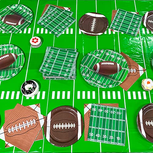 - 【Package Contents】: This football party theme set comes with including for 24 guests: Including 24 7" dessert plate, 24 9" dinner plate, 48 6.5"paper napkins,1 54" x 108"table cover, 97 pcs in total. Save more work than select these items individually.