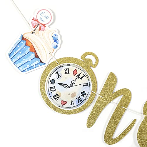 - Material:Gold glitter Alice Wonderland Decorations banner Unique design. Made of high quality cardstock with Gold glitter ,no glitter falling off. comes with high quality White line.Plastic needle.Need to assemble by yourself.