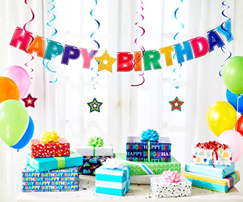 - Kit includes: 3 Swirl decorations with 5 inch cutouts, 3 Swirl decorations, 'Happy Birthday' 1 party Banner