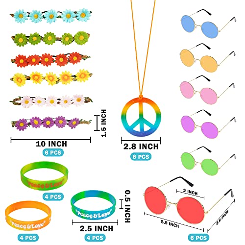 - Quantity: You will receive 6 rainbow peace sign necklaces, 6 daisy flower hair headbands, 6 round hippie sunglasses, 12 hippie silicone bracelets. Children and adults will love these cute hippie party favor supplies!