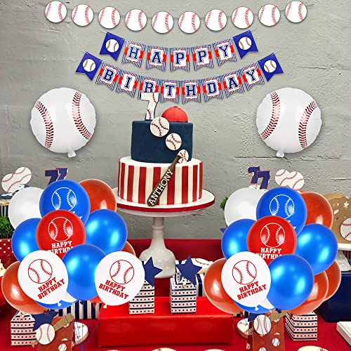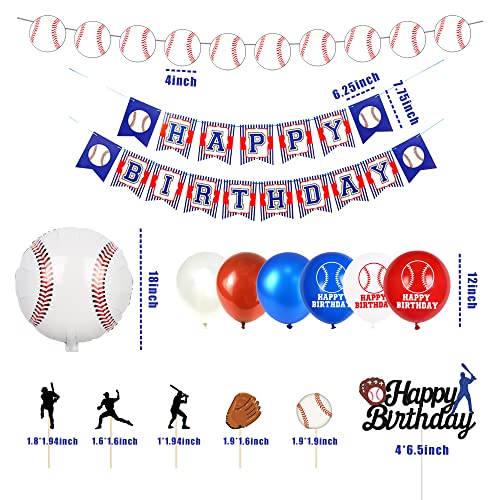 - Package included: 1 x baseball banner, 1 x happy birthday banner, 2 x baseball balloons, 9 x happy birthday balloons with three colors(red, white and blue), 5 x white balloons, 5 x red balloons, 5 x blue balloons, 1 x happy birthday cake topper, 24 x baseball cupcake toppers.