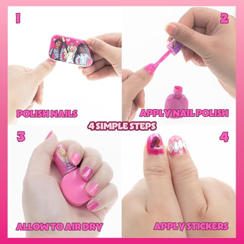 • COMPLETE MAKEUP SET: 9 glitter lip glosses, 9 shimmer eye shadows, 2 shimmer blushes, 3 cosmetic brushes, 2 peelable glitter nail polishes, 1 Barbie nail file, 1 sheet of Barbie nail stickers, 1 sheet of Barbie nail gems, and 1 sheet of Barbie tattoos.