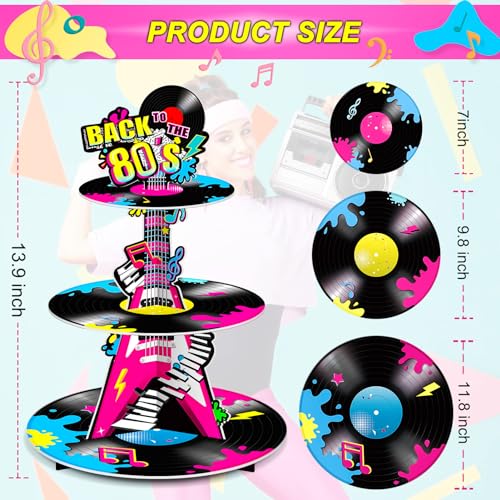 - Package Includes: you will receive 1 piece 3 tier 1980s Birthday theme cupcake holder party decorations, 17.2 inches in height, large tier measure 11.8 inches in diameter, and middle tier is 9.8 inches, small tier is 7.9 inches, which can hold enough cupcake and dessert, proper size make this cupcake holder become a shining party supply for the Retro 80s theme party