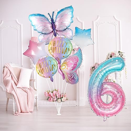 - All In One Design: Butterflies balloons, Giant number 6 foil balloons and pink blue star balloons, a perfect combination of birthday, fantastic Butterflies party favors for kids girls.