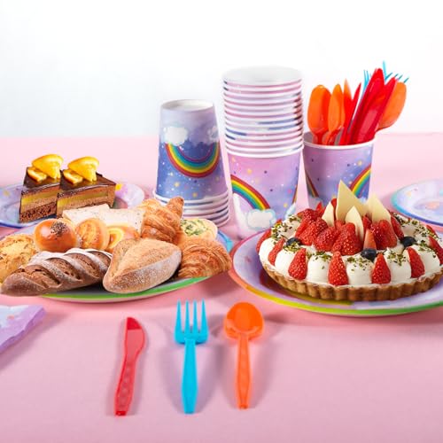 - 【Premium Material】These rainbow themed birthday decorations are made from extra durable materials, safe and non-toxic for kids and adults. The rainbow plates and cups are made from thick paper, safe and sturdy to hold party food or drink without leaking; Knives, forks and spoons are made from plastic, smooth and solid; rainbow tablecloths are made of plastic, waterproof, oilproof and tear resistant