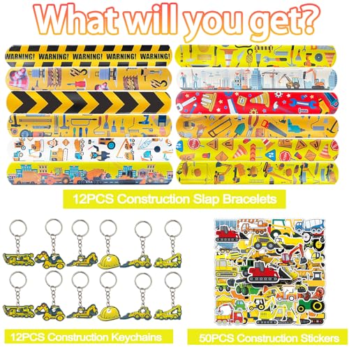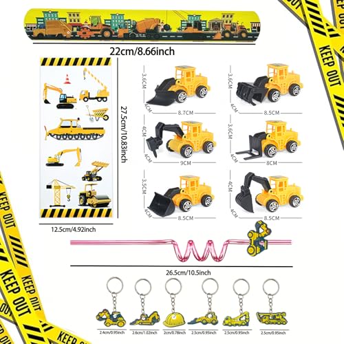 - Construction Themed Party Supplies: you will receive 122 pieces of construction birthday party supplies, including 12 construction truck toys, 12 construction truck slap bracelet, 12 keychains, 12 construction truck drinking straws&12 Straw Accessories , 50 transportation vehicles stickers and 12 construction truck plastic bags, perfect for construction birthday party; These small construction party favor bag fillers are also great for gift fillers.
