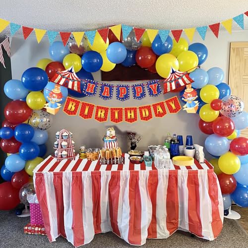 - PACKAGE – The circus party decorations include 1pcs Happy Birthday banner, 1pcs triangle banner, 10pcs balloons and 1pcs circus theme tablecloth. Our circus party decorations can meet your party needs.