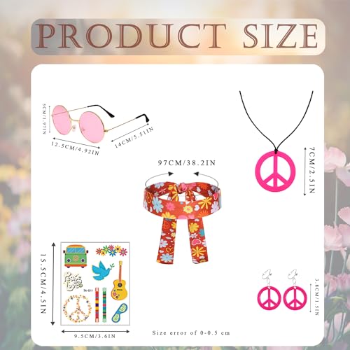 - Complete accessories: you will receive 1*hippie pants, 1*fringe undershirt, 1* floral headband, 2* peace sign earrings (1 pair), 1* peace sign necklace, 1* vintage sunglasses, and 1* tattoo sticker to make you the center of attention at your hippie-themed party!