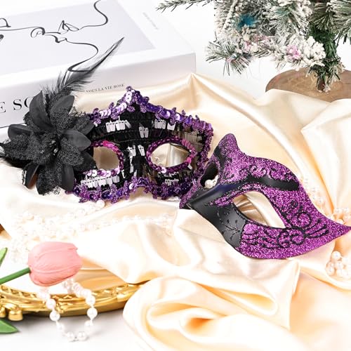 - Couple masquerade mask Set:Package Include 2 pcs Masquerade Masks,One Plastic Masks for Men.With Black Glitter,One Black Plastic Masks for Women,Feather and Flower Decorations,Both the Men's and Women's Masks Have Vintage Elements,with Feathers and Gradients Making the Combination a Great Match