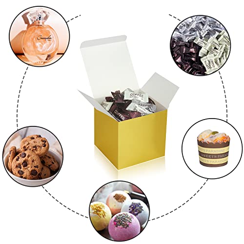 - Size Information: Candy box size is 3x3x3 inch Inches,cube shape, It is already equipped with ribbon and blank tag to complete the outside classy gift looks.Gold favor boxes are applicable to store candies, chocolates, cookies, cupcake, mugs, shot glasses, candles, bath bombs, soaps, perfumes, makeup, jewelry, or other small gift.
