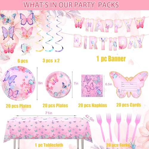 • 【Butterfly Party Supplies】Our Butterfly Birthday Party Supplies Kit includes 20 x Butterfly Invitation Cards, 20 x Butterfly Serving Plates (9 inch), 20 x Butterfly Serving Plates (7 inch), 20 x Butterfly Napkins, 20 x Pink Forks, 1 x Butterfly Happy Birthday Banner, 6 x Butterfly Hanging Decorations, 1 x Pink Butterfly Tablecloth (71 x 42.5 inch). Plenty of quantity for a girl's birthday party to serve up to 20 guests.